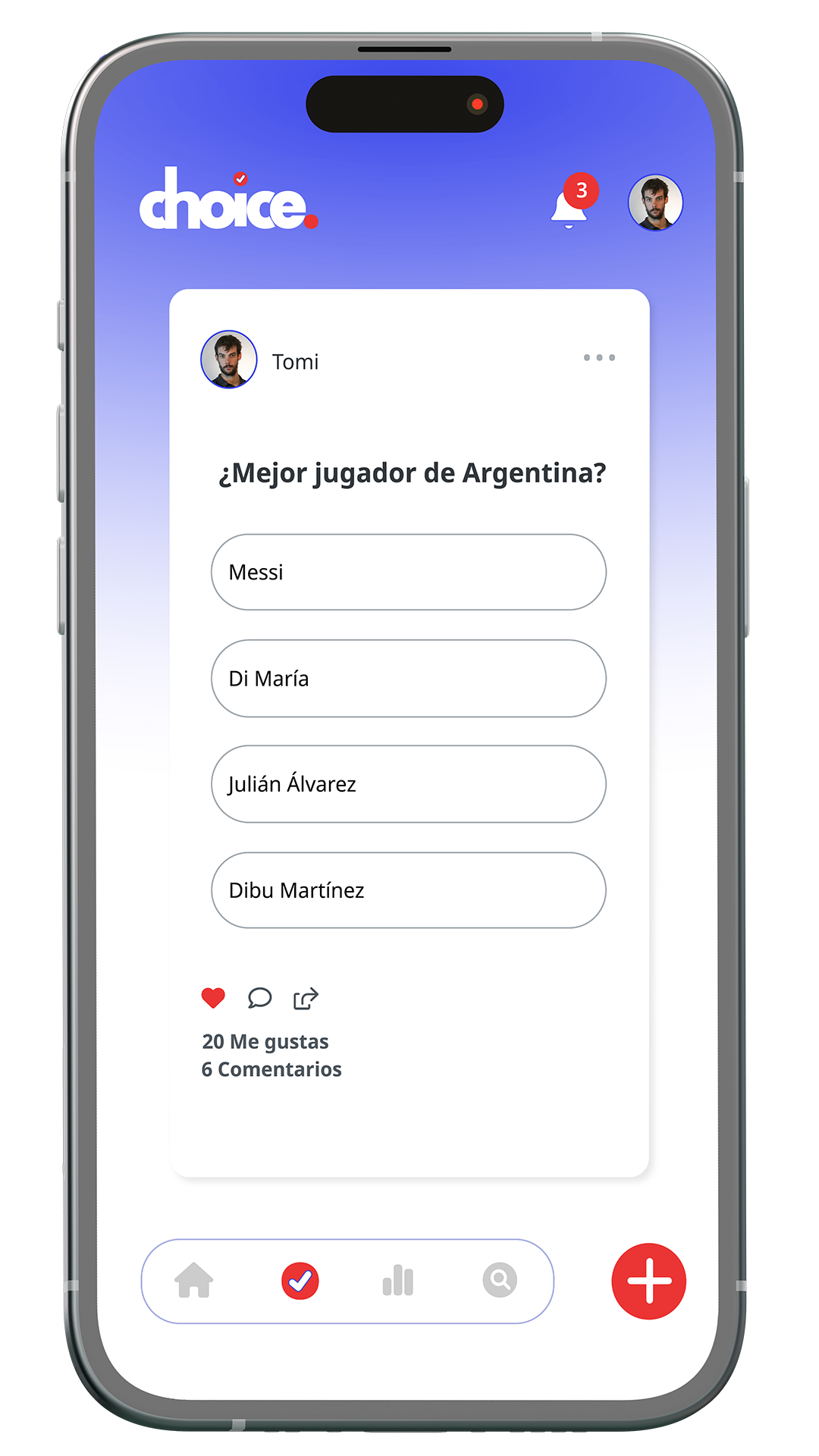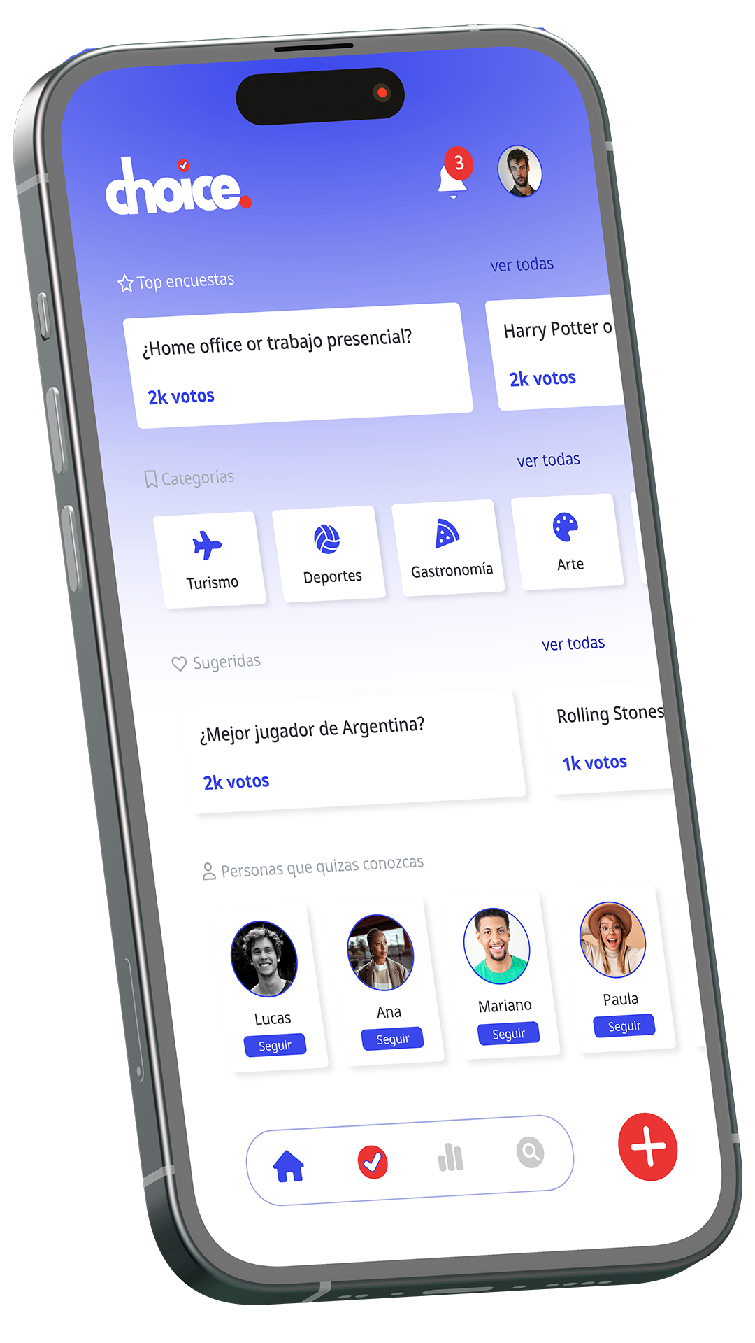 Choice es una aplicación de encuestas de tipo red social donde puedes crear, compartir y responder encuestas sobre una variedad de temas. Es una forma divertida y fácil de conocer opiniones y conectar con otros usuarios que comparten tus intereses.